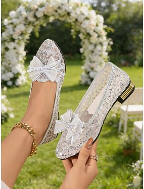 ballerine da donna in pizzo argentato con fiocco – scarpe eleganti e comode per invitati a matrimoni in giardino, prato e all'aperto