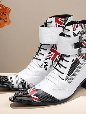 stivali punk rock da uomo in vera pelle bianca e nera con bandiera britannica, stivaletti alla caviglia con lacci in pelle bovina al 100% e cinturini con fibbia per il palcoscenico, il cosplay e la moda gotica