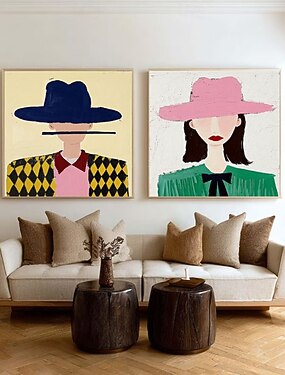 dipinto a olio astratto moderno, elegante e minimalista, fatto a mano, raffigurante un uomo e una donna con cappello, per la decorazione della parete della sala da pranzo, regalo