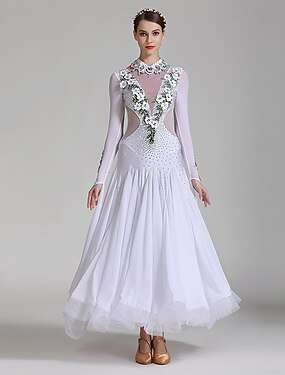 Abito da ballo da sala da donna elegante, bianco, con applicazioni floreali 3D, strass, intaglio, per valzer, tango, rumba moderna, da competizione