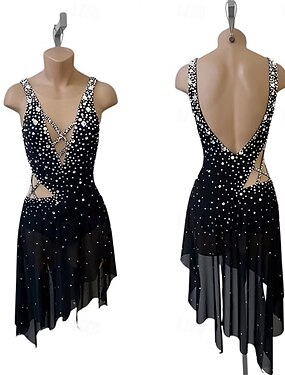 abito da pattinaggio artistico, abito da pattinaggio sul ghiaccio da donna e da ragazza, nero, schiena scoperta, orlo asimmetrico, maglia ad alta elasticità, abbigliamento da pattinaggio per