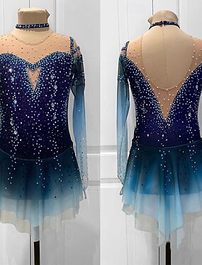 Abito da pattinaggio artistico Per donna Ragazze Pattinaggio sul ghiaccio Vestito Blu Patchwork Foro per il pollice Rete Alta elasticità Allenamento Competizione Vestiti da pattinaggio sul ghiaccio