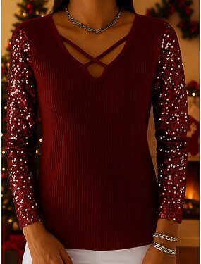 Capodanno Per donna Top con paillettes Elegante Festa Manica Lunga Scollo a V Top Regolari Nero Vino Primavera Autunno Inverno