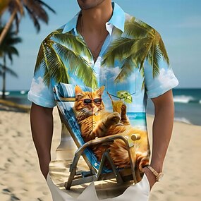 Per uomo Animali Gatto Albero di cocco Camicia hawaiana Camicia con bottoni Camicia Aloha Manica corta Hawaiano Ricorrere Da mare Per eventi Abbigliamento mare Estate Primavera Collo ripiegabile