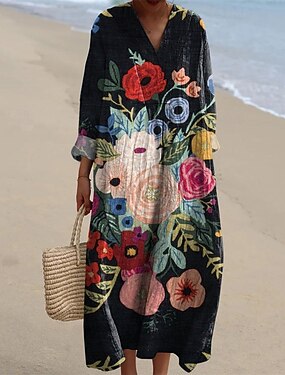 Abito Maxi da Donna Boho Vestito Estivo A-Line Abito Pieghettato Vacanza Casual Andare in giro Vestibilità Larga Grafica Floreale Manica 3/4 V Collo Nero Giallo Blu Verde Estate Primavera