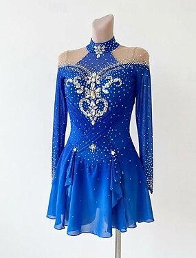 abito da pattinaggio artistico, abito da pattinaggio sul ghiaccio da donna e da ragazza, blu, elastico, allenamento, competizione, abbigliamento da pattinaggio, termico, caldo, cristalli/strass, senza
