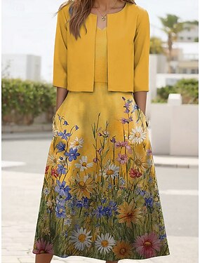 Per donna Abito Lungo Maxi Abito Set di vestiti Classico All'aperto Vacanza Ferie Vestibilità regolare Floreale Manica 3/4 Girocollo Oro Autunno