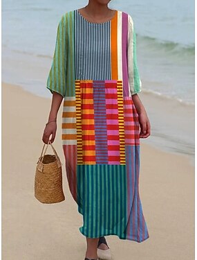 Abito maxi da donna in lino simile traspirante leggero abito a sacco vestito estivo vacanza casual boho abbigliamento da spiaggia quotidiano vestito rilassato grafica geometrica manica 3/4 collo giro