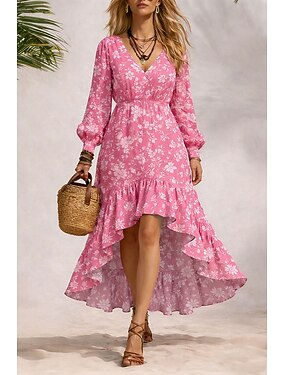 Per donna Abito Midi Abito Boho Vestito Casual Abito Floreale Elegante Moda Moderno All'aperto Vacanza Uscire Vestibilità regolare Floreale Manica Lunga Scollo a V Rosa Estate Primavera