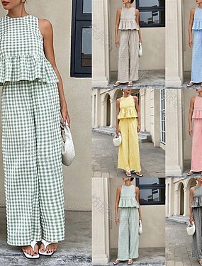 Per donna Set di Pantaloni Bolero Top Senza Maniche Girocollo Plaid Volant Moda Streetwear Casuale Quotidiano All'aperto Blu Nero Giallo Estate Vestibilità regolare