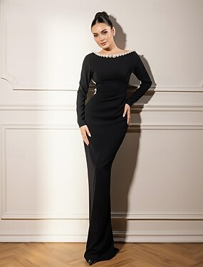 Sirena Tromba Lunghezza al pavimento Abiti da Ballo Abito da Sera Da principessa Abito formale Elegante Vintage Manica Lunga Scollo a Barca Matrimonio Formale Crepe Elasticizzato con Perle
