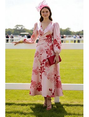 Linea ad A Lunghezza alla caviglia Abiti da Cocktail Elegante Floreale Manica Lunga Scollo a V Festa in giardino Matrimonio Raso con Stampa floreale