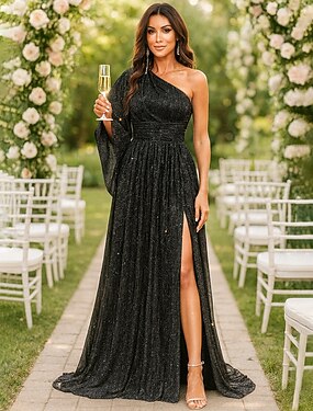 Linea ad A Lunghezza al pavimento Abito da Sera Da principessa Abito formale Elegante Scintillante Spacco Alto Senza Maniche Monospalla Matrimonio Formale Raso con Glitter