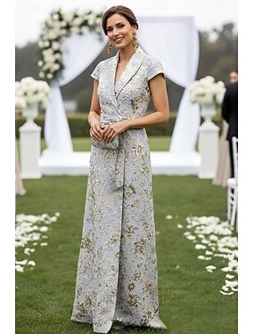 Linea ad A Lunghezza al pavimento Abito da invitata a nozze Abito Formale Abito da sera Abito da cerimonia per signora Manica Corta Scollo a V Bavero Elegante Vintage Formale Ospite di nozze Jacquard