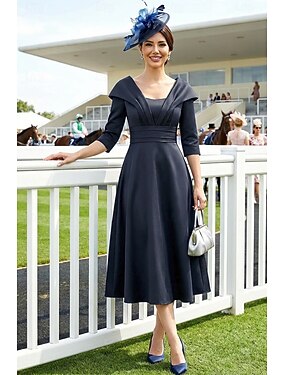 Linea ad A Lunghezza Tè Vestito da Festa Abito da Cocktail Abito da invitata a nozze Abito da cerimonia per signora Mezza Manica Bavero Elegante Minimalista Formale Ospite di nozze Raso con Tinta