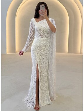 Sirena Tromba Lunghezza al pavimento Abito da ballo con mantello Abito da Sera Abito formale Elegante Vintage Spacco Alto Manica Lunga Scollo a V Matrimonio Formale Con Paillettes con Glitter Spacco