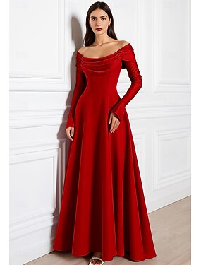 Linea ad A Lunghezza al pavimento Abito da Sera Da principessa Abito formale Elegante Monocolore Setoso Manica Lunga Senza Spalle Matrimonio Formale Tasca Raso con Pieghe Tasca Fiore sulla Spalla