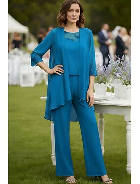 Tre Pezzi Completo Pantalone Lunghezza al pavimento Abito da cerimonia per signora Manica 3/4 Girocollo Elegante Semplice Formale Ospite di nozze Chiffon con Pizzo