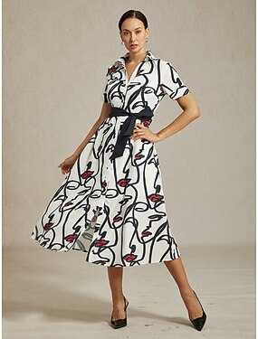 abito casual da donna con bottoni a pois, coulisse, colletto della camicia, elegante, casual, per tutti i giorni, a maniche corte, estivo