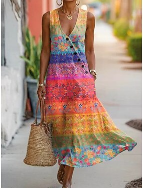 Per donna Abito maxi Abito Boho Vestito Estivo Vestito Casual Abito Etnico Elegante Bohemien Vacanza Spiaggia Ferie Data Vestibilità regolare Floreale Grafico Senza Maniche Scollo a V Blu Viola Verde