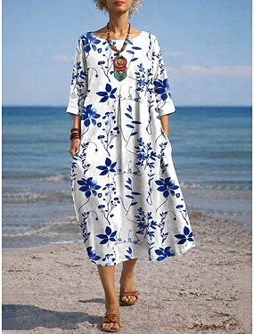 Per donna Abito Midi Vestito Estivo Abito Estivo Vacanza Casual Boho Spiaggia Ferie Vestibilità comoda Floreale Grafico Manica 3/4 Girocollo Blu Bianco Rosa Estate Primavera