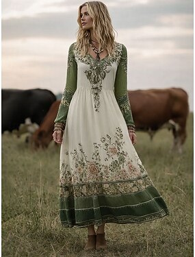 Per donna Abito Midi Abito a trapezio Festa Casual Boho Data Vestibilità comoda Floreale Grafico Manica Lunga Scollo a V Rosa Verde Estate Primavera