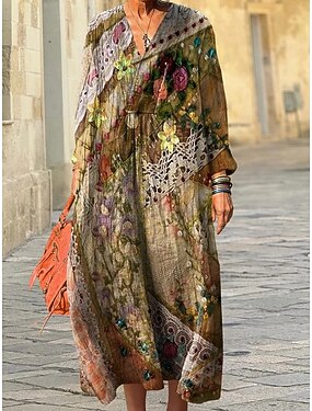 Per donna Abito maxi Abito a trapezio Abito Pieghettato Abito aderente e svasato Boho Data Uscire Vestibilità comoda Floreale Grafico Manica Lunga Scollo a V Viola Marrone Verde Primavera Autunno