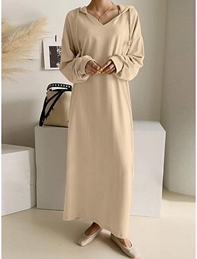 Abito maxi in lino donna in misto cotone abito a sacco casual quotidiano vestibilità ampia tinta unita con maniche lunghe con cappuccio nero marrone chiaro grigio primavera autunno inverno