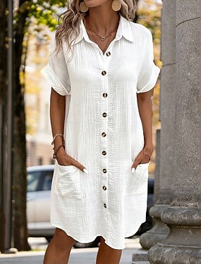 Per donna Mini Abito Abito Camicia Abito Bianco Abiti in cotone e lino Essenziale Casual Quotidiano All'aperto Vacanza Vestibilità comoda Colore Puro Manica Corta Colletto a Camicia Nero Bianco