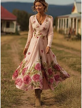 Per donna Abito Midi Abito a trapezio Festa Casual Boho Data Vestibilità regolare Floreale Grafico Manica Lunga Scollo a V Rosa Estate Primavera