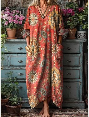 Per donna Abito lungo maxi Vestito Casual Vintage africano Quotidiano All'aperto Vacanza Vestibilità regolare Floreale Manica Lunga Scollo a V Blu Rosa polveroso Viola Arancione Estate Primavera