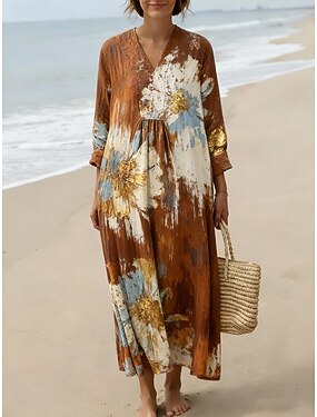 Per donna Abito maxi Abito a trapezio Vacanza Casual Boho Uscire Spiaggia Vestibilità comoda Floreale Grafico Manica Lunga Scollo a V Giallo Chiaro Rosa chiaro Rosa Viola Estate Primavera Autunno