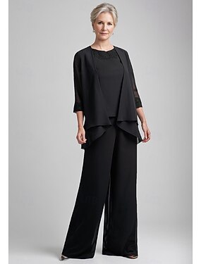 Tuta Completo Pantalone Tre Pezzi Lunghezza al pavimento Abito da cerimonia per signora Senza Maniche Scollo a Barca Elegante Taglie Forti Con Stola Ospite di nozze Chiffon Abiti con Giacca con Tinta