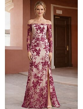 Tubino Colonna Lunghezza al pavimento Perline ricamate Abito Formale Abito da madre della sposa Abito da Sera Abito formale Elegante Vintage Scintillante Manica Lunga Scollo Illusione Matrimonio