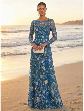 Abito a lunghezza terra A-Line Abiti formali Abito da sera Abito per madre della sposa Maniche lunghe Collo a rotondo Elegante Vintage Festa con perline