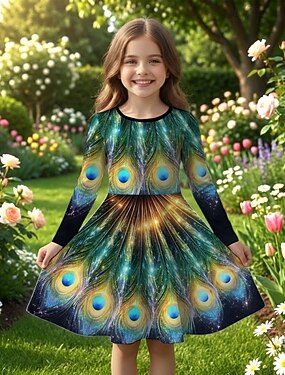 ragazze' 3D Grafico Pavone Abito Manica Lunga Stampa 3D Primavera Autunno Quotidiano Vacanza Feste Casual Principessa Bello Bambini 4-12 Anni Vestito Casual Abito a trapezio Lunghezza al ginocchio