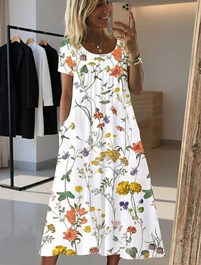 Per donna Abito Midi Vestito Casual Abito Floreale Elegante Classico Moderno Quotidiano All'aperto Spiaggia Vestibilità regolare Floreale Mezza Manica Girocollo Bianco Estate Primavera
