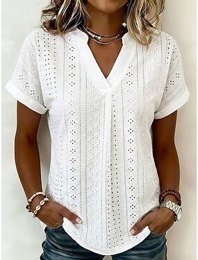 Per donna Top traforato Maglietta traforata Maglietta Testurizzato Elegante Classico Manica Corta Scollo a V Top Regolari Casuale Spiaggia Bianco Estate Primavera