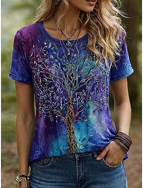 Per donna Maglietta Stampato Floreale Grafico Piante Bohemien Hawaiano Elegante Manica Corta Girocollo Top Regolari Quotidiano Viola Estate Primavera