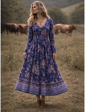 Vestito Midi Boho da donna Vestito a Linea Festa Casual Appuntamento Vestibilità Regolare Grafica Floreale Maniche Lunghe Collo a V Rosso Viola Arancione Verde Estate Primavera Autunno