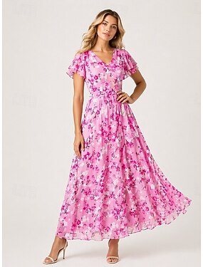 Per donna Abito Midi Vestito in Chiffon Abito da Cocktail Abito Floreale Abito Stampato Moda Moderno All'aperto Vacanza Tè Vestibilità regolare Fiore Manica Corta Scollo a V Blu Rosa Viola Verde