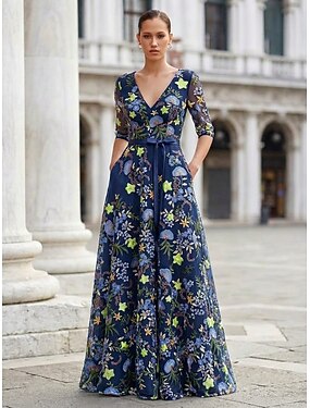 Linea ad A Lunghezza al pavimento Abito da Sera Elegante Vintage Floreale Mezza Manica Scollo a V Festa serale Matrimonio Tasca Raso Tulle con Fiore ricamato Pieghe Ricamo