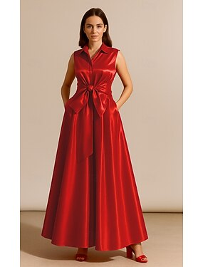 Linea ad A Lunghezza al pavimento Abiti da Cocktail Elegante Senza Maniche Colletto a Camicia Festa in giardino Matrimonio Raso Elasticizzato con Pieghe