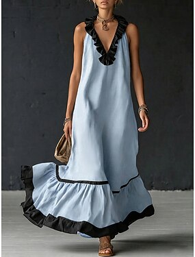 abito lungo da donna in finto cotone e lino, abito casual a trapezio, elegante con orlo a balze, bicolore, senza maniche, scollo a V, blu, rosa, beige, estate, primavera, autunno
