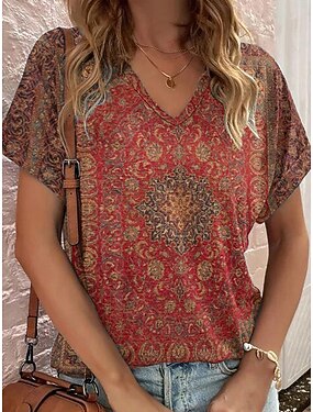 Per donna Maglietta Stampato Grafico Geometrico Paisley Vintage Elegante Classico Manica Corta Scollo a V Top Regolari Quotidiano Weekend Abbigliamento da vacanza Blu Vino Marrone Estate Primavera