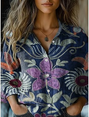 Per donna Camicia Finto cotone e lino Bottoni Stampato Floreale Grafico Bohemien Attivo Vintage Manica Lunga Colletto a Camicia Top Regolari Quotidiano Ferie Blu Estate Primavera Autunno