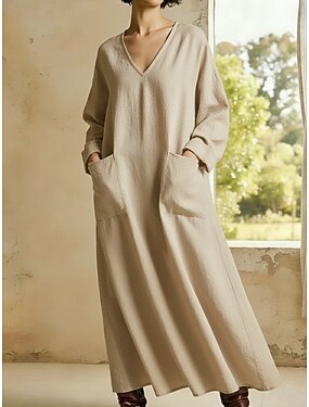 Per donna Abito maxi Finto cotone e lino Vestito Casual Elegante Moda Moderno All'aperto Vacanza Uscire Vestibilità comoda Semplice Manica Lunga Scollo a V Bianco Giallo Borgogna Cachi Estate