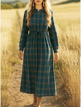 Per donna Abito Midi Vestito Casual Abito a Tubino Vintage Quotidiano All'aperto Vacanza Vestibilità comoda Plaid Manica Lunga Scollo a V Blu Estate Primavera Autunno