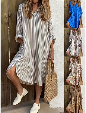 Per donna Abito al ginocchio Abito a Tubino Vestito Casual Moda Moderno Quotidiano Vacanza Uscire Vestibilità comoda Floreale A righe Manica Lunga Colletto a Camicia Blu Rosso Marrone Cachi Primavera