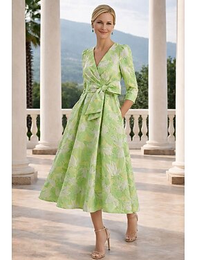 Linea ad A Lunghezza Tè Abiti da Cocktail Elegante Vintage Floreale Manica Lunga Scollo a V Festa in giardino Matrimonio Tasca Jacquard con Stampa floreale Fiocco/Fiocchi